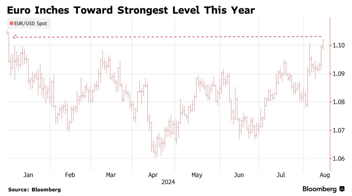 欧元兑美元自8月初以来上涨了约2%,此前美国7月份就业报告弱于预期,交易员加大了对美联储降息的押注。欧元兑美元目前距离今年高点1.1054仅差0.3%。