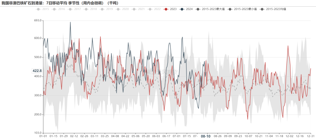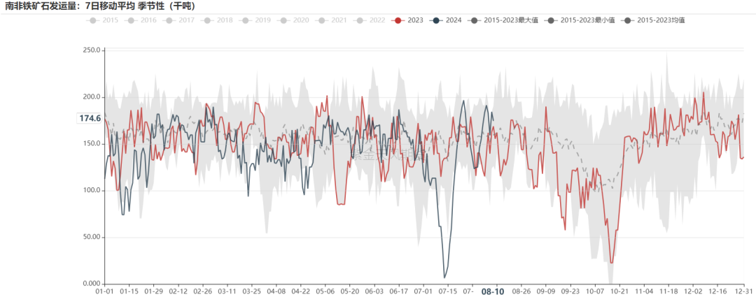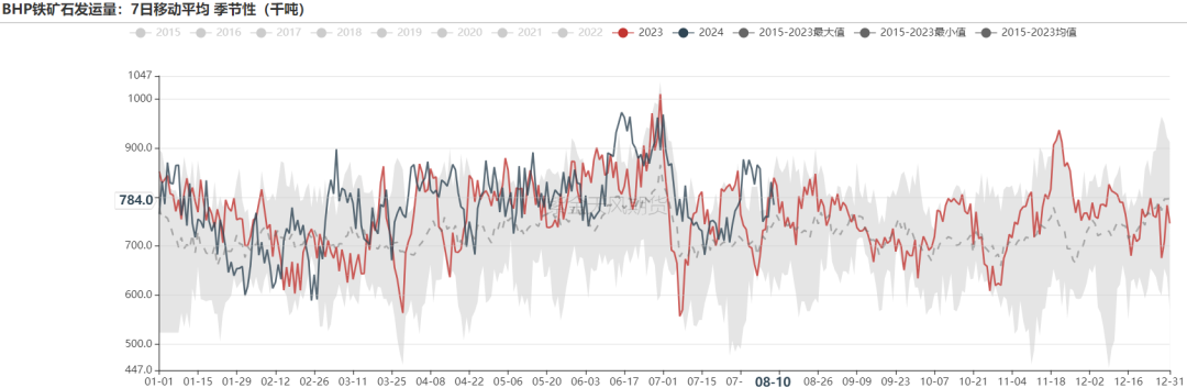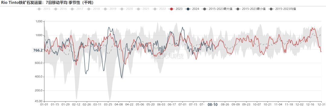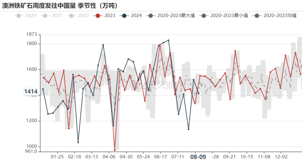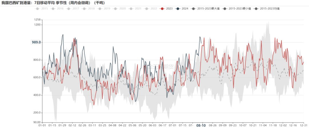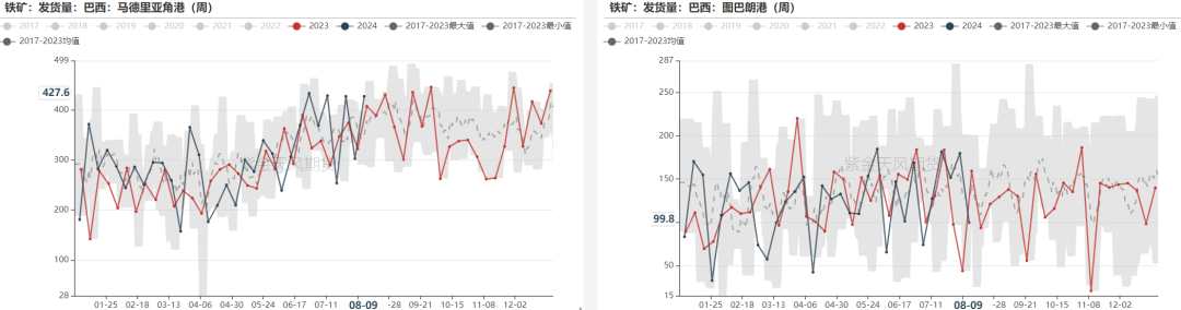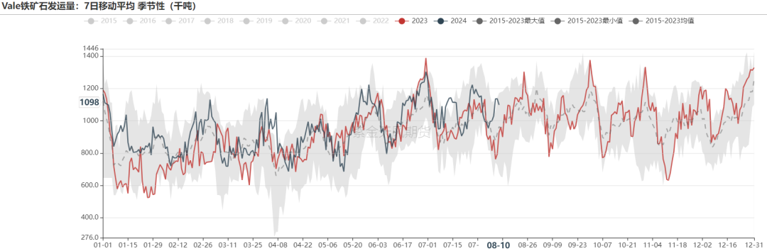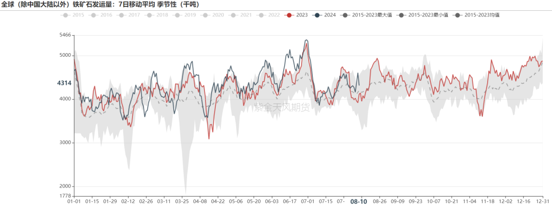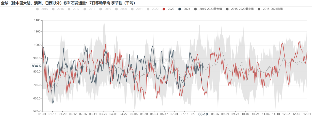 路透口径:2024年8月10日,路透全球铁矿7日移动平均发货量4314千吨,周环比增1.2%,同比增4.9%。澳洲7日移动平均发货量2316千吨,周环比减6.2%,同比减6.9%;巴西7日移动平均发货量1163千吨,周环比增16%,同比增22%。