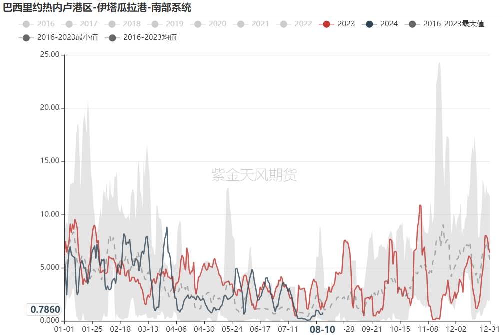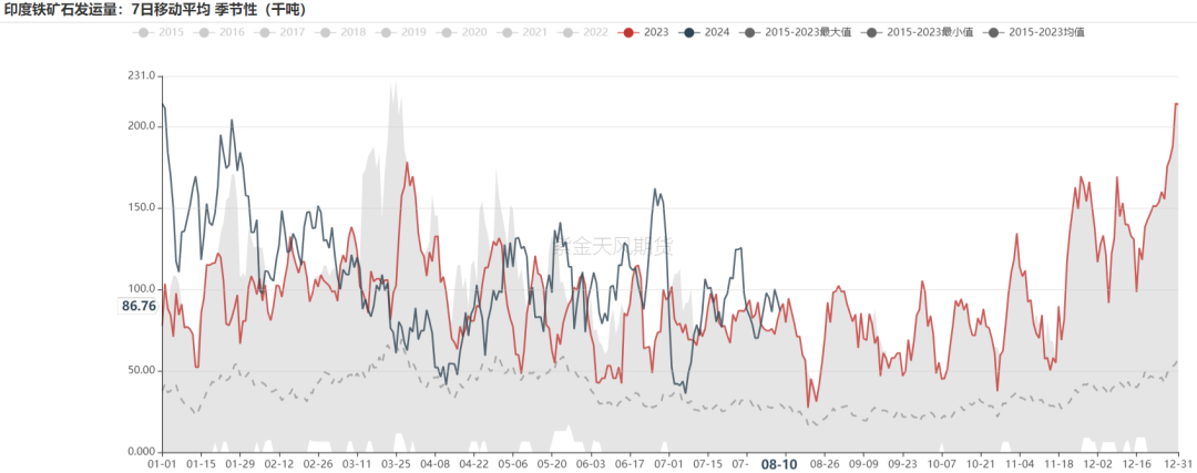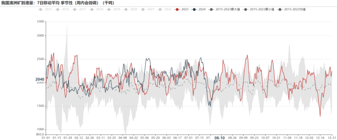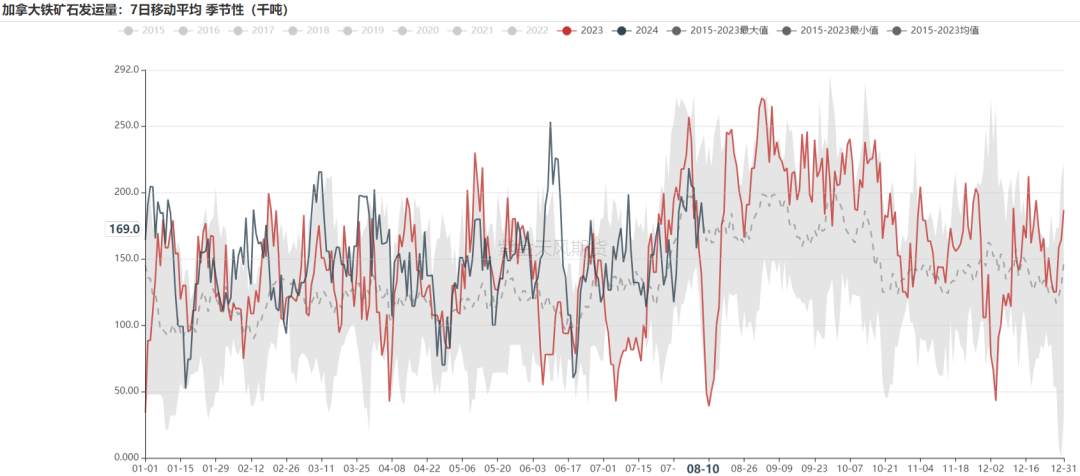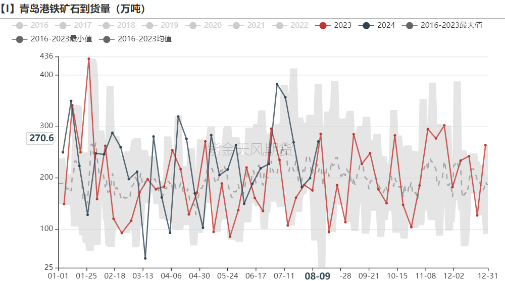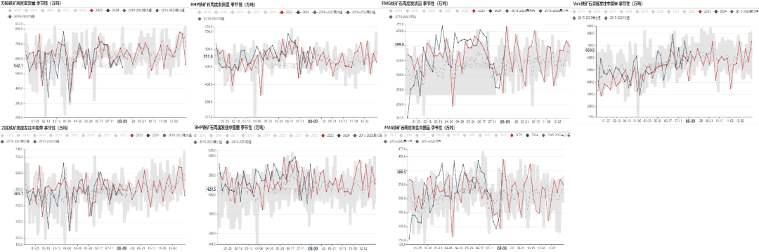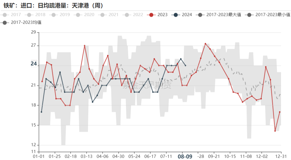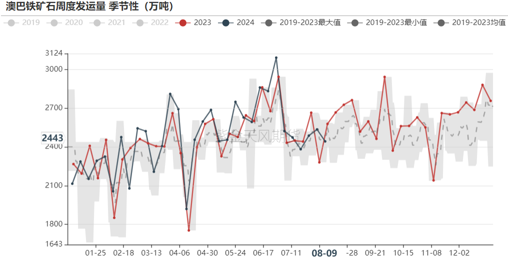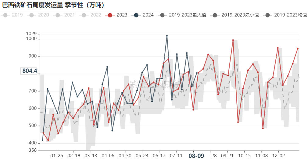 路透口径:2024年8月10日,路透全球铁矿7日移动平均发货量4314千吨,周环比增1.2%,同比增4.9%。澳洲7日移动平均发货量2316千吨,周环比减6.2%,同比减6.9%;巴西7日移动平均发货量1163千吨,周环比增16%,同比增22%。