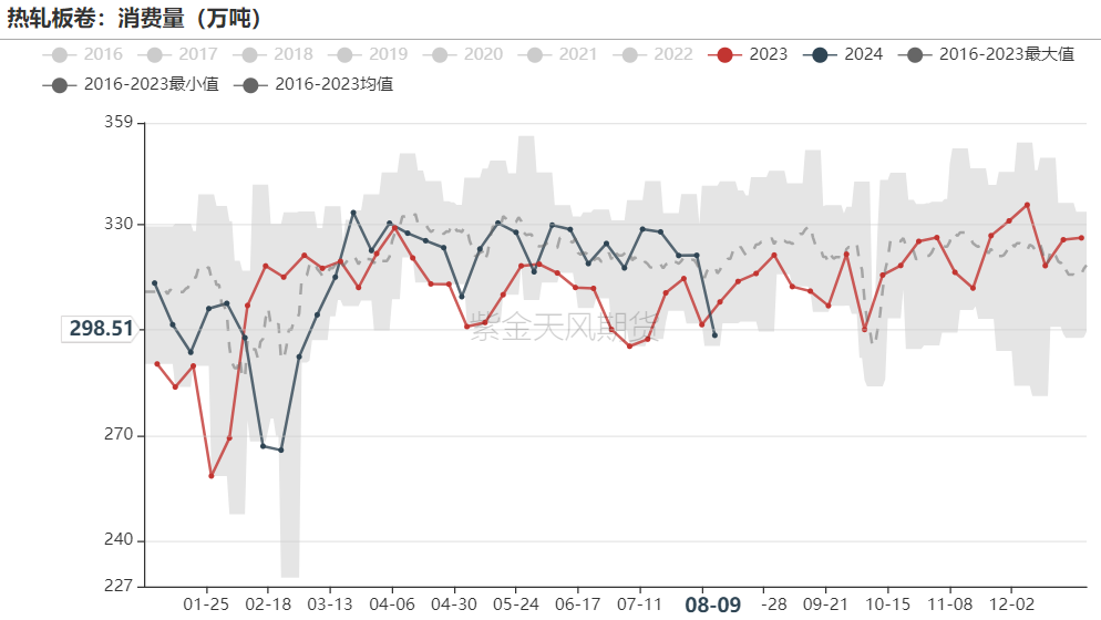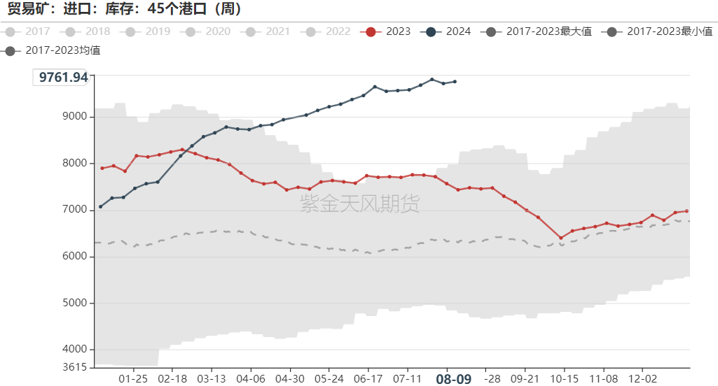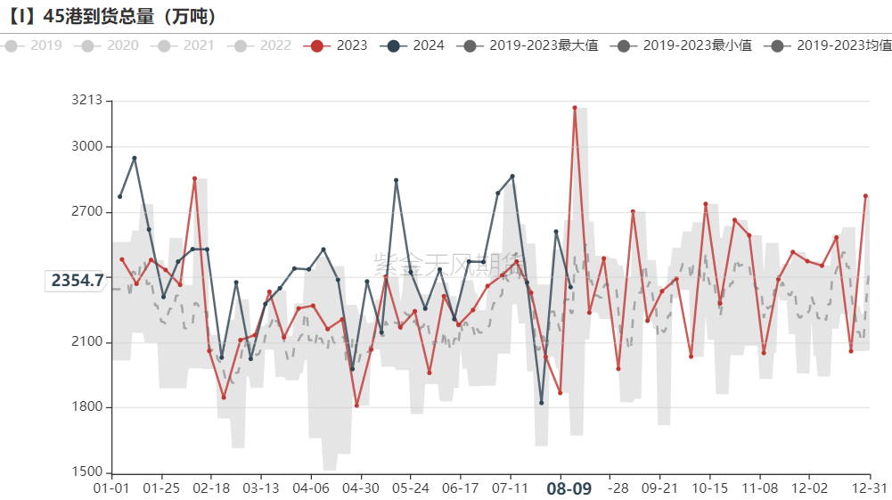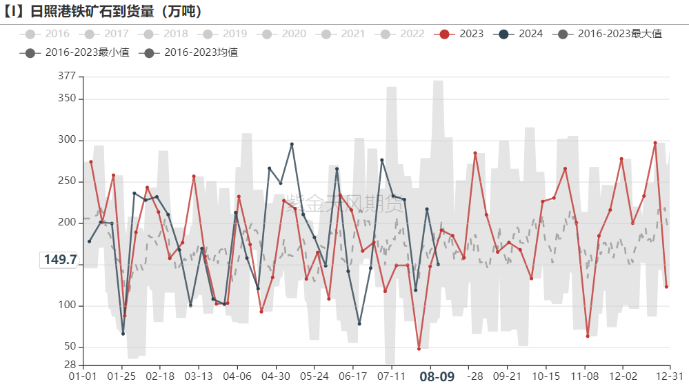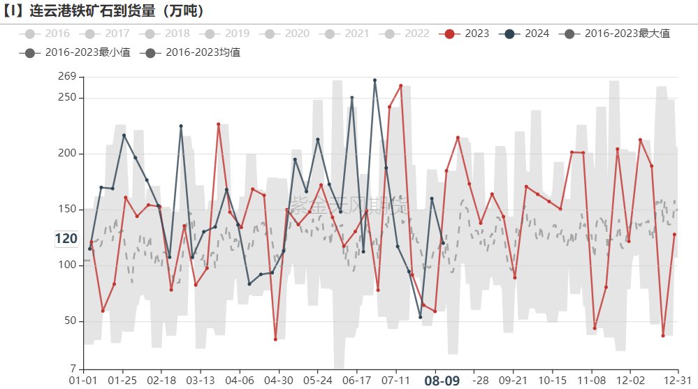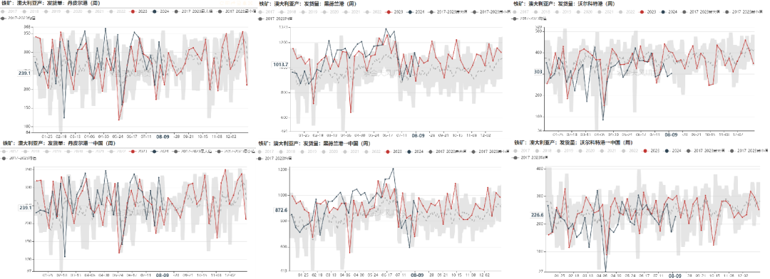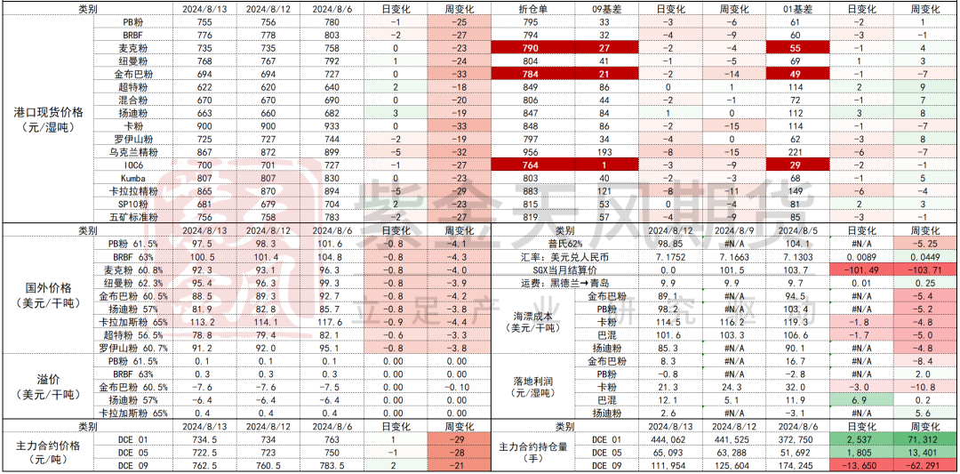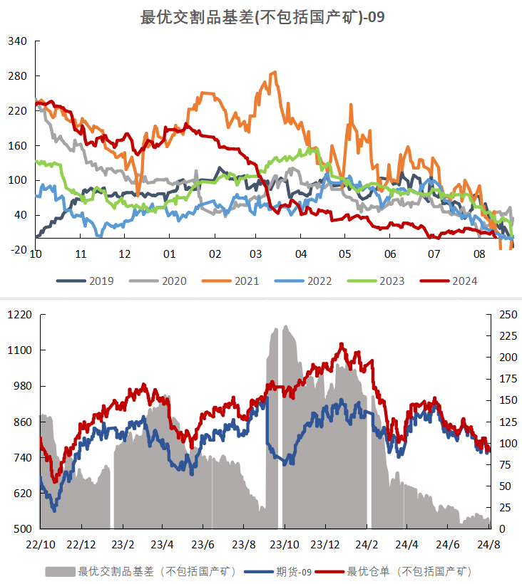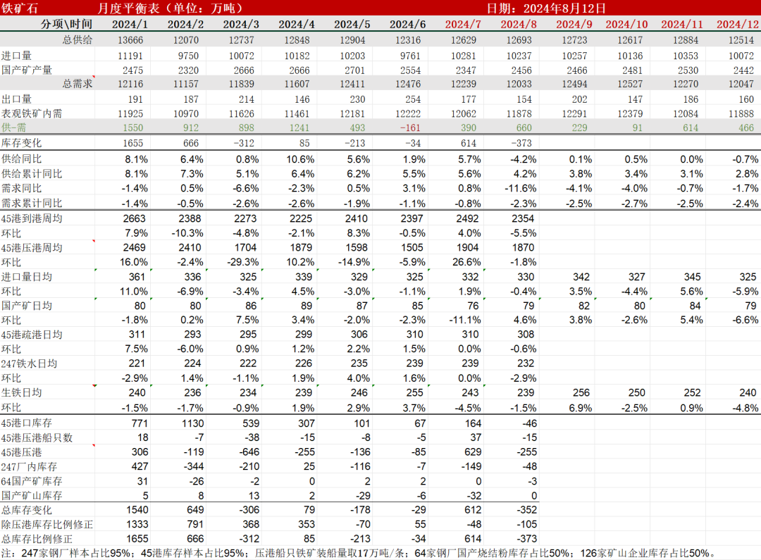 周度评述 上周供应端发运小幅上行;澳巴发运表现同比去年偏弱,巴西同比增量明显,非主流发运暂稳。台风过后,我国到港量快速回升。需求端受钢厂低盈利率影响,铁水减量明显,247日均铁水-4.92吨至231.7万吨,8月铁水产量仍有进一步下降空间。铁矿现货成交量下行,远期货成交量下行,成交量与去年同期基本持平。废铁价差下行,废钢性价比提升。库存端近期有所下降,总量仍维持高库存状态,钢厂进口矿库存环比减77万吨;45港库存环比减46万吨。供应端将长期处于宽松状态;成材库存小幅去库,钢坯库存继续累库,终端需求未见明显好转。现阶段钢厂因亏损有明显减产,但铁水绝对值仍处近4年同期偏高水平,后期仍有减量预期;铁矿入炉品位降低,低品矿流动性增强,港口去库幅度加大;目前短期震荡偏空,关注后期需求端情况。