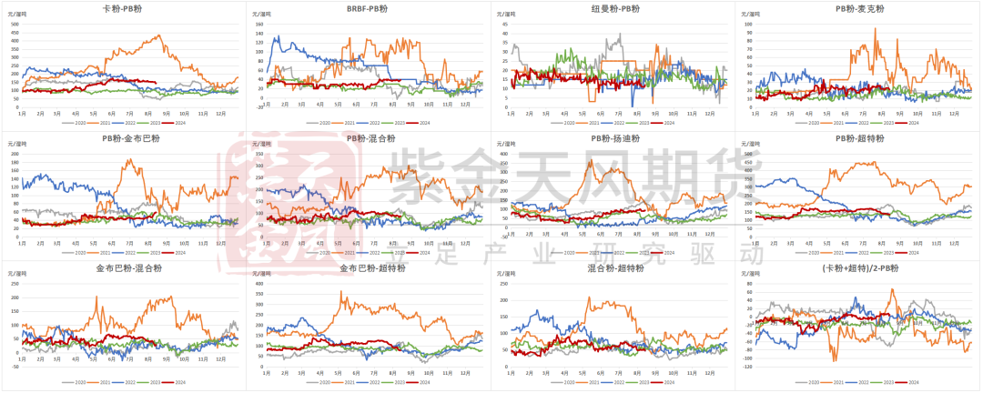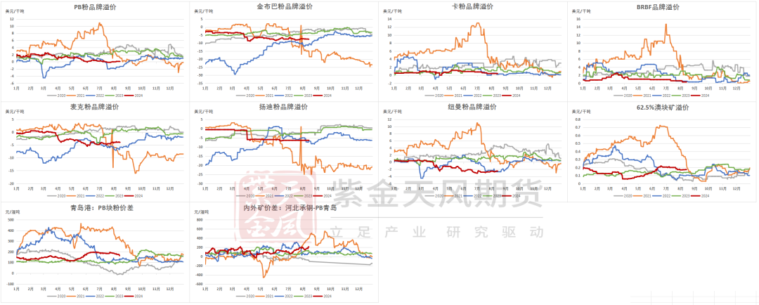 品种间差异 金布巴粉价格走弱;主流粉溢价暂稳,块粉价差走弱,内外矿价差走扩。