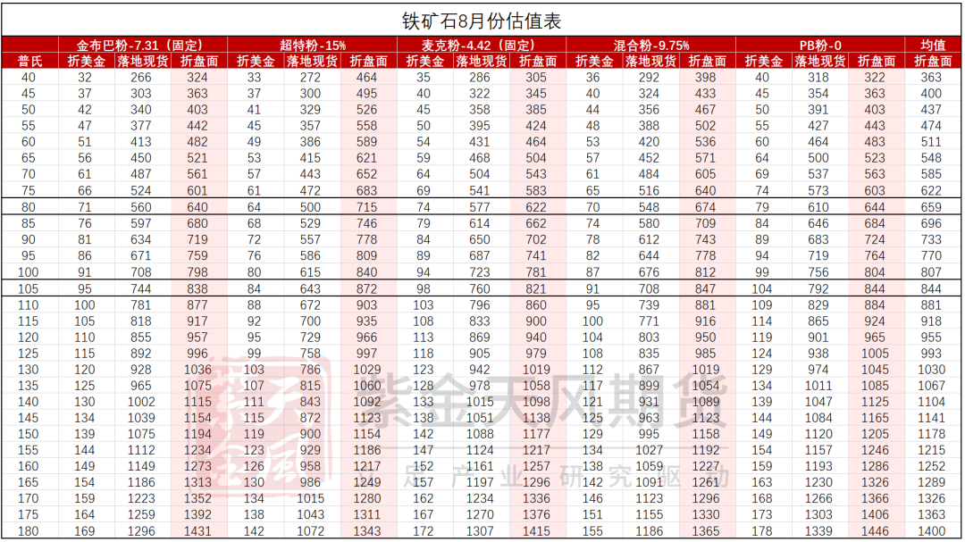 折扣&汇率 8月普氏62指数均值为102,对应盘面估值约为797。