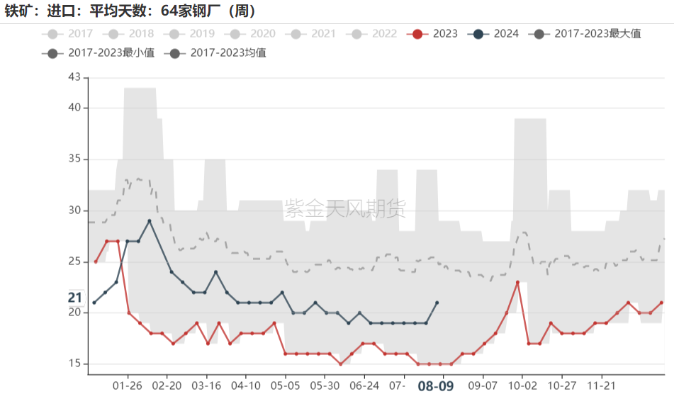 钢厂:钢厂进口矿总库存减77万吨,厂库减48万吨,海漂+港口减29万吨;进口矿可用天数环比增2天至21天