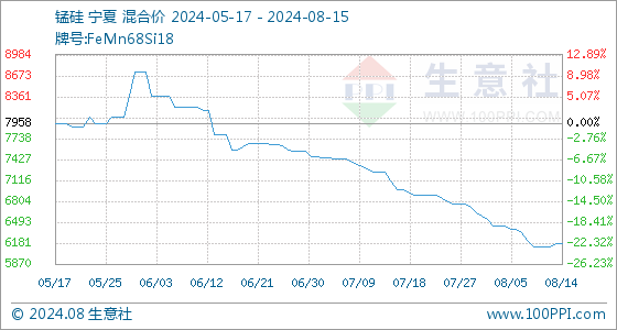 8月15日,生意社锰硅基准价为6170.00元/吨,与本月初(6580.00元/吨)相比,下降了-6.23%。
