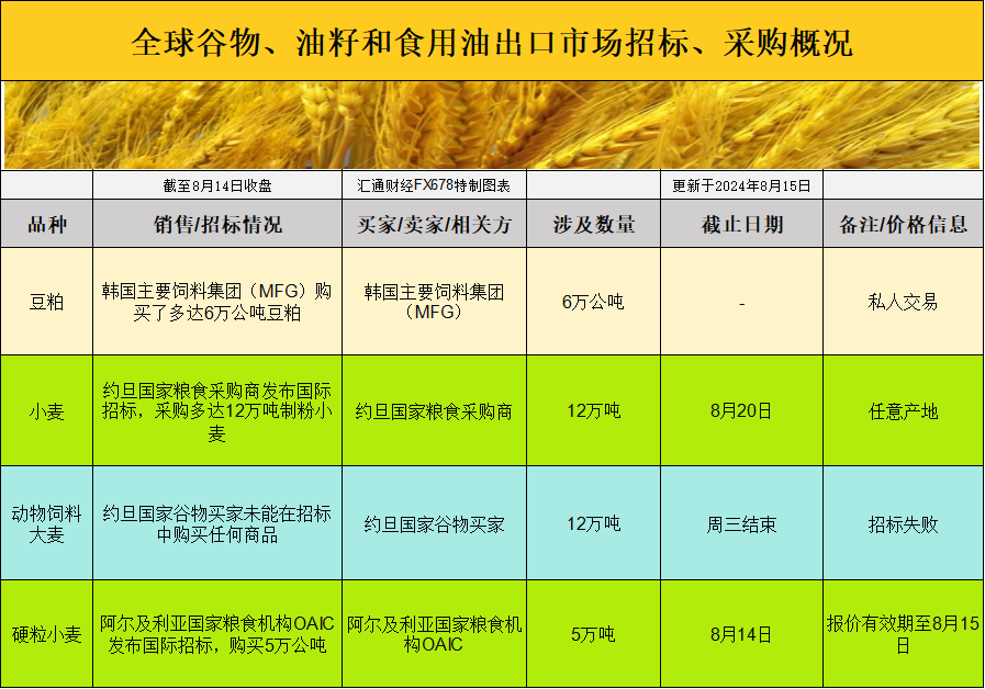 约旦国家粮食采购商已发布国际招标,采购多达12万吨的制粉小麦,这些小麦可从任意产地采购。然而,约旦国家谷物买家在12万公吨动物饲料大麦国际招标中没有购买任何商品。