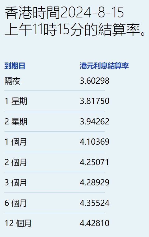 8月15日,港元拆息个别发展,其中,隔夜息回落16基点至3.60298%,为5月7日以来最低,而与楼按相关的一个月拆息则连升两天,报4.10369%,创逾一周新高。