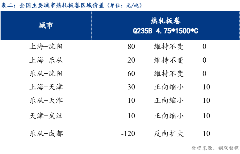 从品种价差来看,卷螺差较上一交易日正向缩小6元/吨,热中价差较上一交易日反向扩大6元/吨,热带价差较上一交易日正向扩大8元/吨,热冷价差较上一交易日反向扩大12元/吨。