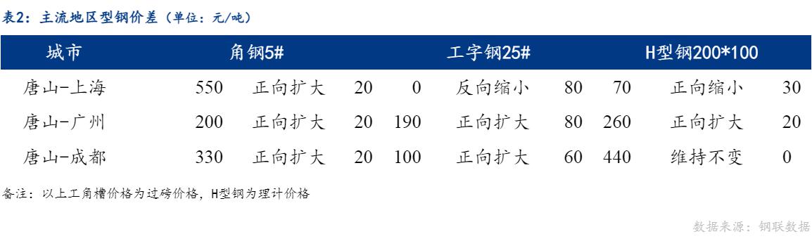 从区域价差来看,唐山与上海角钢价差正向扩大,与工字钢价差反向缩小,与H型钢价差正向缩小;唐山与广州角钢、工字钢、H型钢价差正向扩大;唐山与成都角钢、工字钢价差正向扩大,与H型钢价差维持不变。