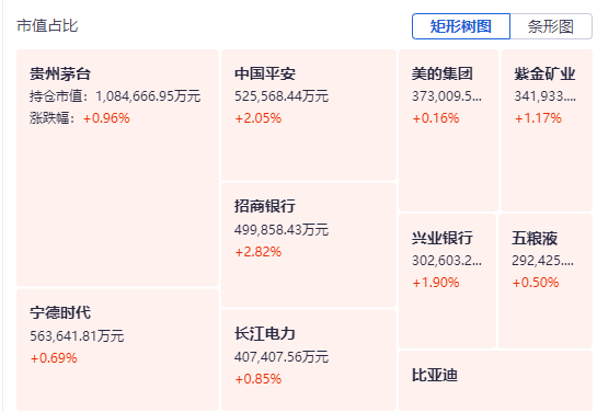 同花顺iFind显示,截至2024年第二季度,规模最大的华泰柏瑞沪深300ETF前十大持仓股分别为贵州茅台、宁德时代、中国平安、招商银行、长江电力、美的集团、紫金矿业、五粮液和比亚迪,上述股票今日全线飘红。