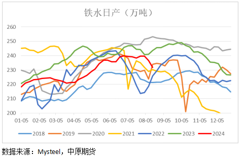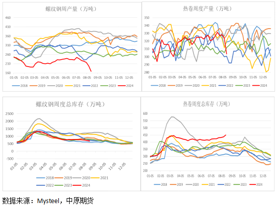 此外,原料端自身基本面来看,焦炭四轮提降后,焦企利润明显收缩,下游钢厂到货控量,导致部分焦企小幅累库,市场看降预期仍存,目前已有五轮甚至六轮提降预期。这也直接导致上游炼焦煤采购谨慎,甘其毛都口岸监管区去库效率下降,可存放空间减少,使得查干哈达至甘其毛都口岸境外排队车辆大面积滞留,8月日均通关数下滑至1000车以下。铁矿石方面,目前发运整体持稳,后续澳洲巴西以及到港方面均有小幅回升空间,且港口库存偏高,基于铁水继续下降趋势,原料端负反馈压力仍存。