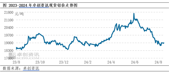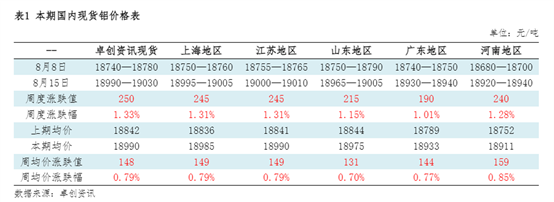 本期国内现货铝价震荡上涨。截至8月15日,卓创资讯现货铝价为18990-19030元/吨,日均价19010元/吨,较上期上涨250元/吨,涨幅1.33%;较去年同期上涨540元/吨,涨幅2.92%。期内均价18990元/吨,较上期上涨148元/吨,涨幅0.79%。