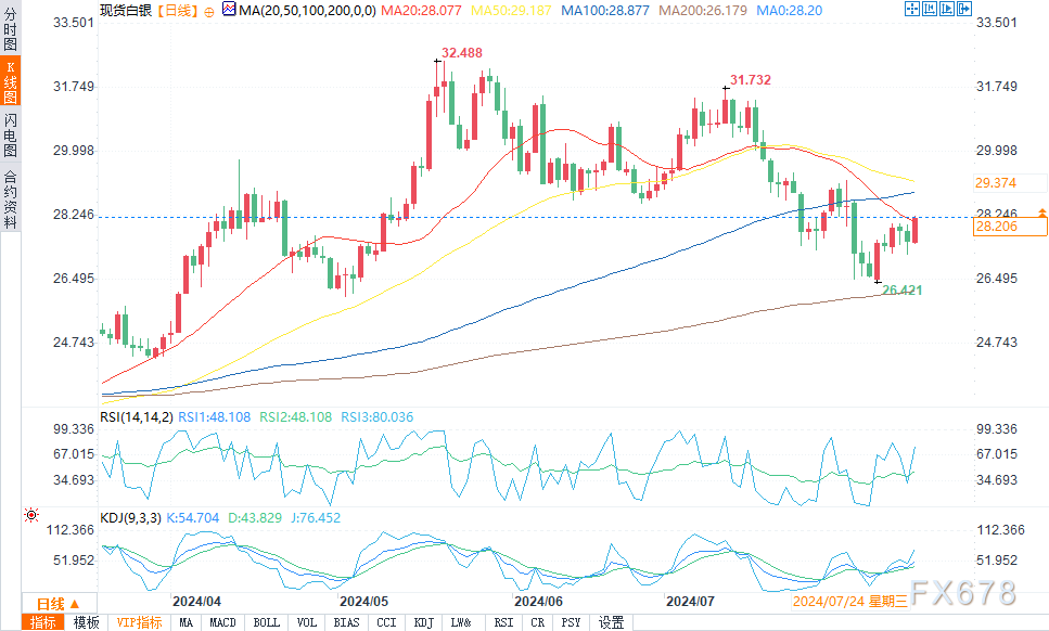 现货白银盘中报28.200美元/盎司,涨幅2.39%。