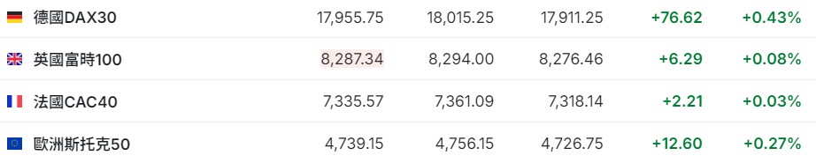 2. 截至发稿,德国DAX指数涨0.43%,英国富时100指数涨0.08%,法国CAC40指数涨0.03%,欧洲斯托克50指数涨0.27%。