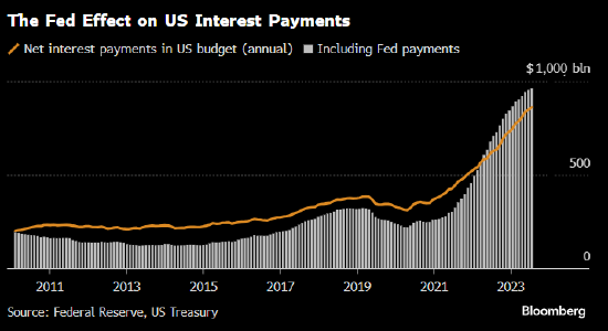 但还有另一笔政府利息支出没有体现在预算中。过去一年美联储的支出令政府的实际利息账单增加了约1,000亿美元。总额比政府每年对美国国家航空航天局、联邦紧急事务管理局和小企业管理局的支出总和还多。