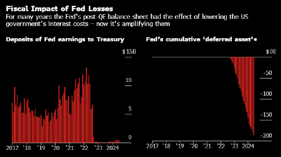 美联储的累计损失(即递延资产)最近一直在以每周近乎20亿美元的速度扩张,本月达到1,880亿美元。直到2022年,美联储还一度向财政部汇款约1,000亿美元。
