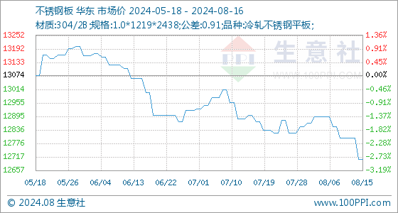 8月16日生意社不锈钢板基准价为12707.14元/吨