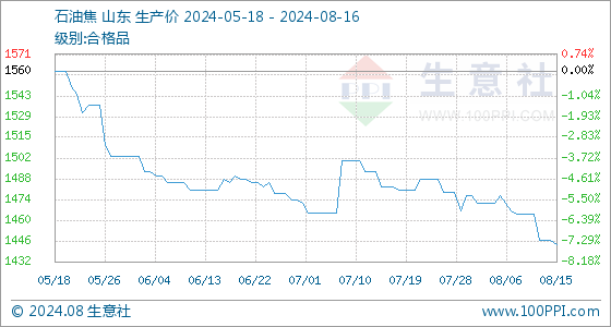 8月16日,生意社石油焦基准价为1444.00元/吨,与本月初(1476.75元/吨)相比,下降了-2.22%。