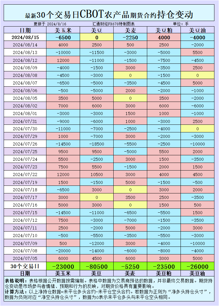 在8月15日的交易中,大宗商品基金对CBOT大豆的持仓变动显示出市场情绪的微妙变化。尽管大豆未平仓多头与空头相同,但整体而言,大宗商品基金在最近30个交易日中增加了对大豆的投机性净空头持仓。这一变化可能反映了市场对美国大豆产量创纪录的预期以及亚洲需求放缓的担忧。