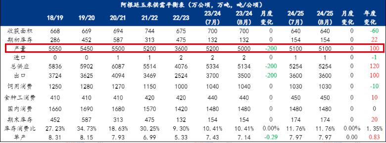 周二美国农业部公布8月玉米供需报告,根据美国农业部8月份供需报告显示,2023/2024年度世界玉米种植面积较上月预估调增8万公顷,玉米产量较上月预估调减164万吨至12.24亿吨。进口量和出口量较上月预估分别调减6万吨和36万吨。下游消费来看,饲用消费较上月预估调增277万吨,食用种用和工业消费较上月预估调减302万吨,总消费调减25万吨。全球库存消费比为25.59%,较上月预估调减0.05%。新作方面,2024/2025年度世界玉米种植面积较上月预估调减17万公顷,产量较上月调减497万吨至12.2亿吨,但依旧处于近几年高位;进口量较上月调减66万吨,出口量较上月调减34万吨。下游消费来看,饲用消费较上月调减195万吨,食种工消费较上月预估调减248万吨,总体需求同比仍旧较弱。从主要玉米生产国来看,巴西阿根廷新作产量与7月预估一致,美国略微上调,全球玉米整体供应仍处宽松水平,预计美玉米盘面或仍以弱势震荡为主。
