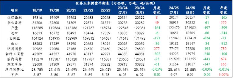 年度变化来看,2024/2025年度较上年度面积减少165万公顷,产量减少399万吨至12.20亿吨,依旧处于近年来高点。进口量和出口量分别减少66万吨和34万吨。下游消费来看,饲用消费较上年度增加780万吨,食用种子和工业消费较上年度减少106万吨,总消费较上年度增加674万吨。期末库存较上年度增加165万吨。整体上看全球玉米供需格局仍旧偏宽松,新作在无意外天气扰动的情况下依旧保持丰产预期。