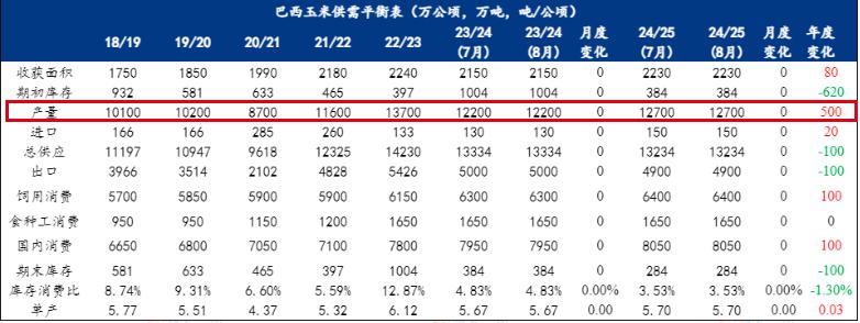巴西、阿根廷新作玉米平衡表均维持较上月不变,巴西依旧维持新作玉米产量在1.27亿吨,同比去年增加500万吨;阿根廷预估新作玉米产量在5100万吨,同比去年增加100万吨。不难看出,USDA预计巴西和阿根廷在新作关键种植期的天气扰动目前为止并没有对其产量造成不利影响,主产国的玉米产量依旧相对充足。