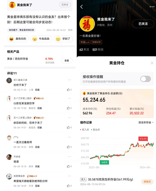 这种实时交易的积存金产品,可灵活应对市场波动,成为投资者的心头好。一位名叫“黄金我来了”的淘金客,就在京东金融赚取了2万元的积存金投资收益。他分享经验表示,“震荡期间大家可以用一部分资金高买低卖赚取差价”。这一专业的投资风格,被老粉丝“当场认领”。原来,他曾是一位有着1.2万粉丝的ETF资深玩家。