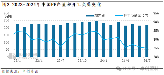 需求方面,2024年7月份农膜需求小幅跟进,其中PO膜需求陆续启动,开工有所提升,但提升有限,同时受原料价格下跌影响,下游工厂采购意向谨慎,按需补仓居多;其余下游行业开工延续低位运行,部分下游开工月内有所下降,整体订单欠佳,对原料采购意向偏弱,货源消化缓慢。
