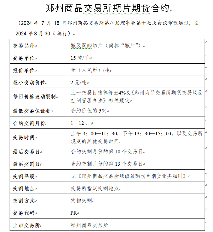 根据郑商所发布的瓶片期货合约及业务细则,瓶片期货交易代码为PR,交易单位15吨/手,每日价格波动限制为上一交易日结算价±4%及交易所相关规定,最低交易保证金为合约价值的5%,合约交割月份为1—12月,交割方式采用实物交割。