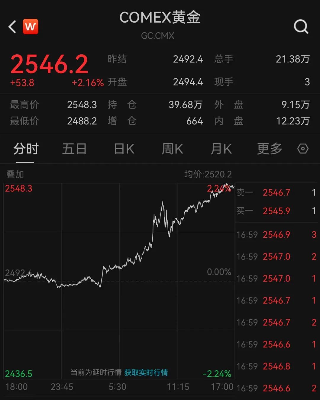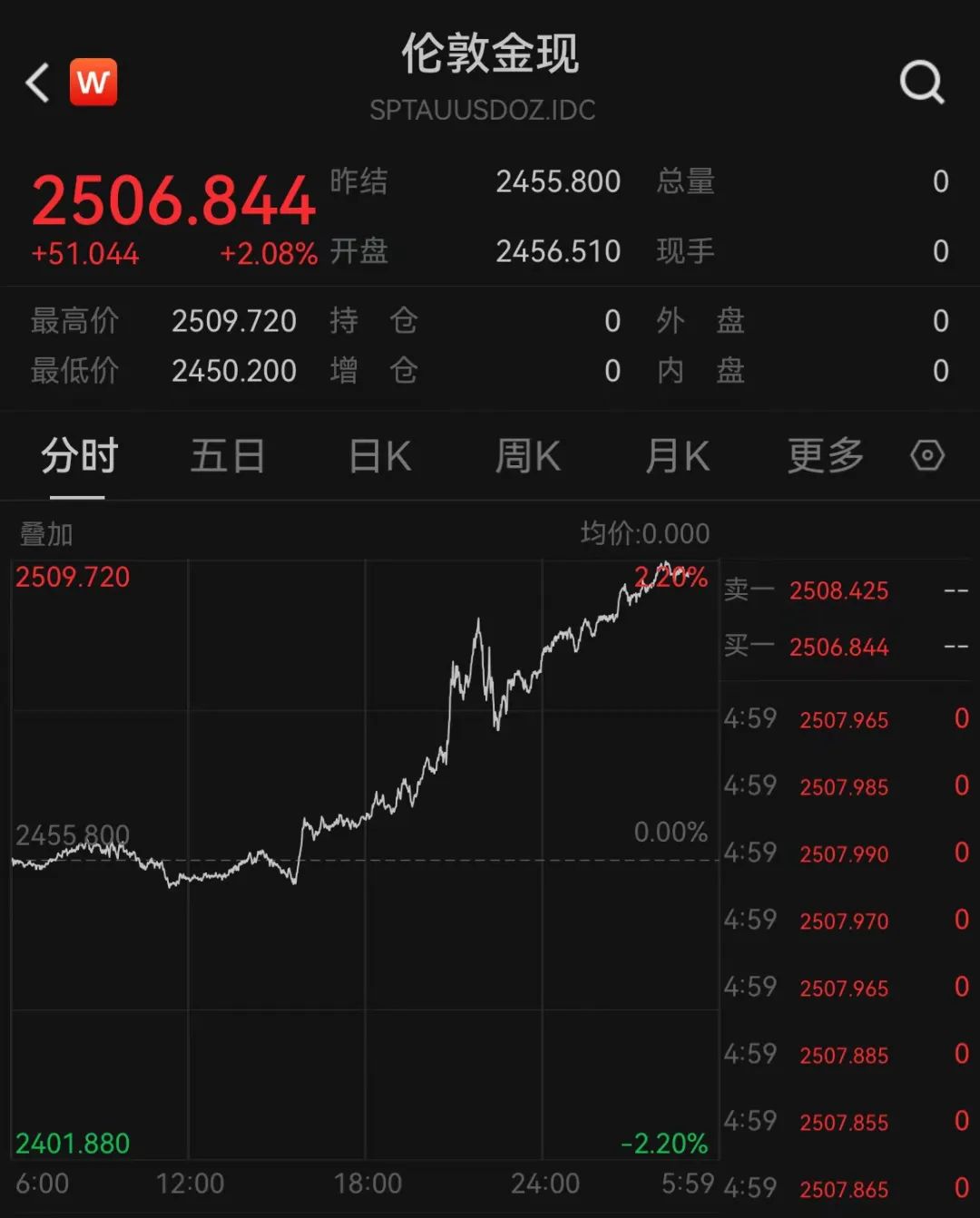 伦敦现货金最高涨幅达2.20%,上探2509.72美元/盎司,收报2506.84美元/盎司,涨2.08%。