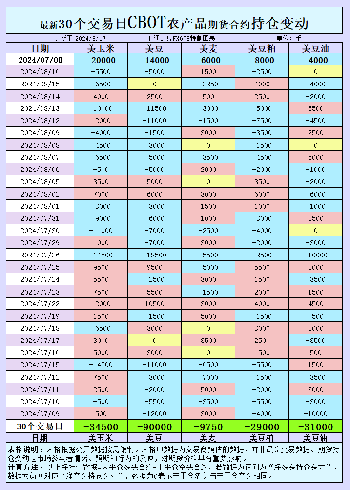 增加CBOT玉米投机性净空头;增加CBOT大豆投机性净空头;增加CBOT小麦投机性净空头;增加CBOT豆粕投机性净空头;增加CBOT豆油投机性净空头。