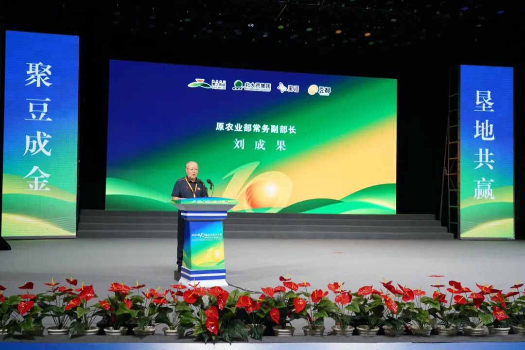刘成果在致辞中用“三年北大荒、一生农垦情”来表达对北大荒的深情厚谊,他说,这次大会是节会结合、垦地融合的一次创新。通过这次大会垦地双方的合作将进一步加深,大豆产业的振兴在这里看到了希望。希望北大荒将先进成熟的大豆种植集成技术辐射到地方,带动农民增产增收,也希望垦地双方在加工、营销等方面形成合力,“聚豆成金、垦地共赢”的局面一定会实现。