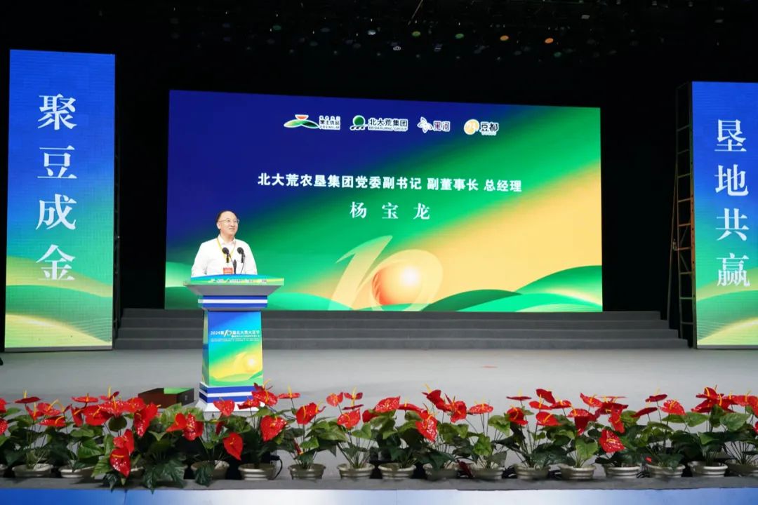 杨宝龙对各位领导和嘉宾的到来表示欢迎。他说,北大荒集团始终积极服务国家战略,坚决扛起保障国家粮食安全的政治责任。经过三代北大荒人的艰苦奋斗,已经建设成为我国耕地规模最大、现代化程度最高、综合生产能力最强的国家粮食战略保障基地。北大荒集团坚持农业产业化经营理念,培育了完达山、九三、垦丰种业等一批民族产业,“北大荒”品牌价值达到2315.98亿元。黑河地区是全国最大的大豆良种繁育基地、国家级绿色食品原料标准化大豆生产基地、国家救灾备荒大豆种子储备基地,产业基础雄厚,希望垦地双方继续携手,共同推动区域大豆全产业链高质量发展,助力中国大豆产业振兴。