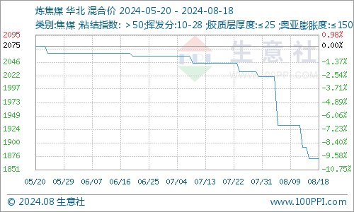 据生意社商品分析系统显示,炼焦煤价格本周市场弱势下滑。据生意社数据分析系统显示,截至到8月16日,炼焦煤市场均价为1872元/吨,较月初下降-7.30%。