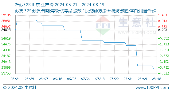 8月19日,生意社棉纱32S基准价为23875.00元/吨,与本月初(24450.00元/吨)相比,下降了-2.35%。