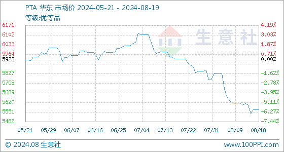 8月19日,生意社PTA基准价为5566.11元/吨,与本月初(5781.11元/吨)相比,下降了-3.72%。