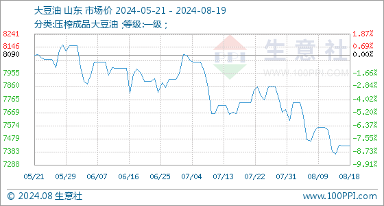 8月19日,生意社大豆油基准价为7424.00元/吨,与本月初(7692.00元/吨)相比,下降了-3.48%。