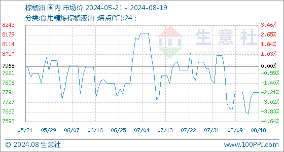 8月19日生意社棕榈油基准价为7792.00元/吨