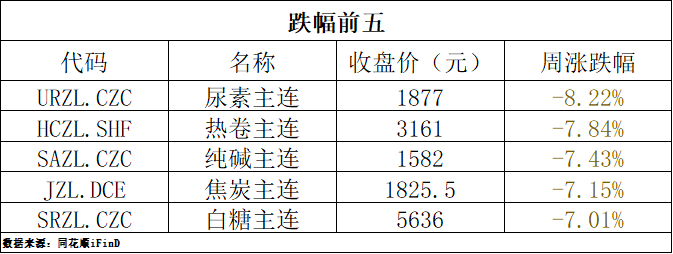 上周国内期货主连跌幅位居前五的分别是尿素-8.22%、热卷-7.84%、纯碱-7.43%、焦炭-7.15%、白糖-7.01%(编注:尿素、白糖主力合约换月)。