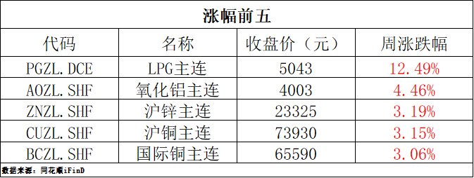 上周国内期货主连涨幅位居前五的分别是LPG12.49%(编注:主力合约换月)、氧化铝4.46%、沪锌3.19%、沪铜3.15%、国际铜3.06%。