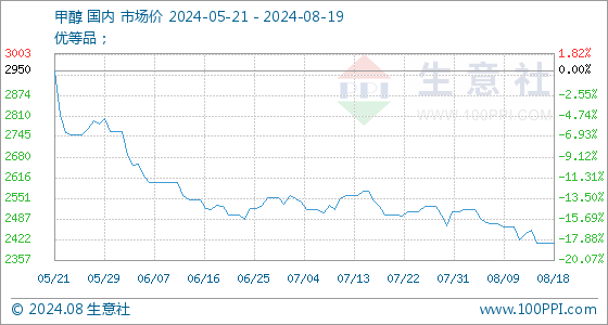 8月19日,生意社甲醇基准价为2411.67元/吨,与本月初(2510.00元/吨)相比,下降了-3.92%。