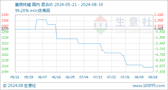8月19日,生意社重质纯碱基准价为2110.00元/吨,与本月初(2140.00元/吨)相比,下降了-1.40%。
