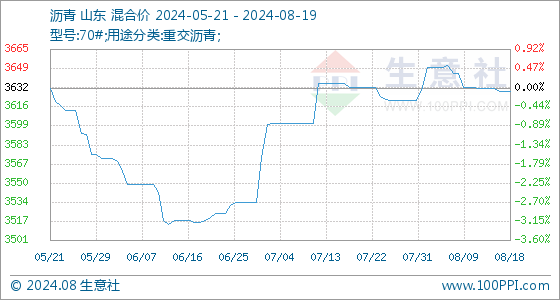 8月19日,生意社沥青基准价为3629.50元/吨,与本月初(3622.00元/吨)相比,上涨了0.21%。