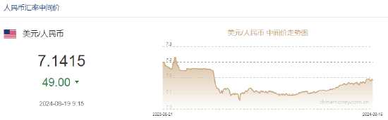 8月19日,人民币中间价报7.1415,上调49点,上一交易日中间价报7.1464。