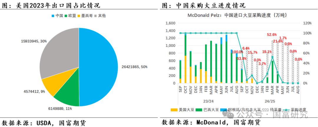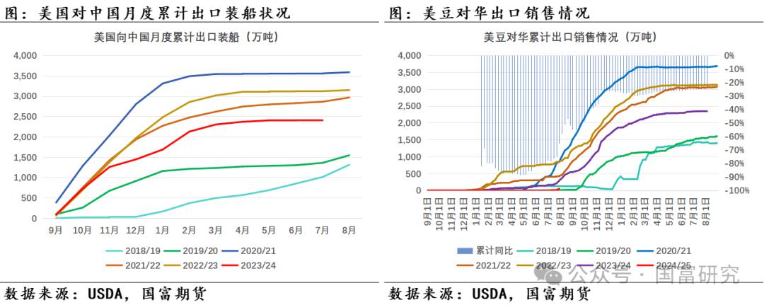 新作方面,此次月报将美豆24/25年度出口上调了2500万蒲至18.5亿蒲,同比23/24年度增长8.82%。但从周度累计出口数据来看,截止到8月8日,美豆24/25年度大豆预售达586.52万吨,23/24年度同期预售量为918.57万吨,新作预售较去年同期减少了36.15%,24/25年度美豆预售情况不佳。究其原因,一方面是南美大豆丰产叠加价格优势,美豆出口份额受到南美大豆出口挤占。另一方面,中国近期对美豆新作采购进度偏慢,根据McDonald公布截止到8月13日的采船数据,尽管中国采购的10月和11月船期以美豆为主,但采购进度仅为6.4%和15.7%,数据显示中国对美豆新作采购情况较为低迷。USDA月报对美豆新作出口的强预期和当前美豆出口的弱现实不匹配,美豆24/25年度出口有较大的下调可能性。