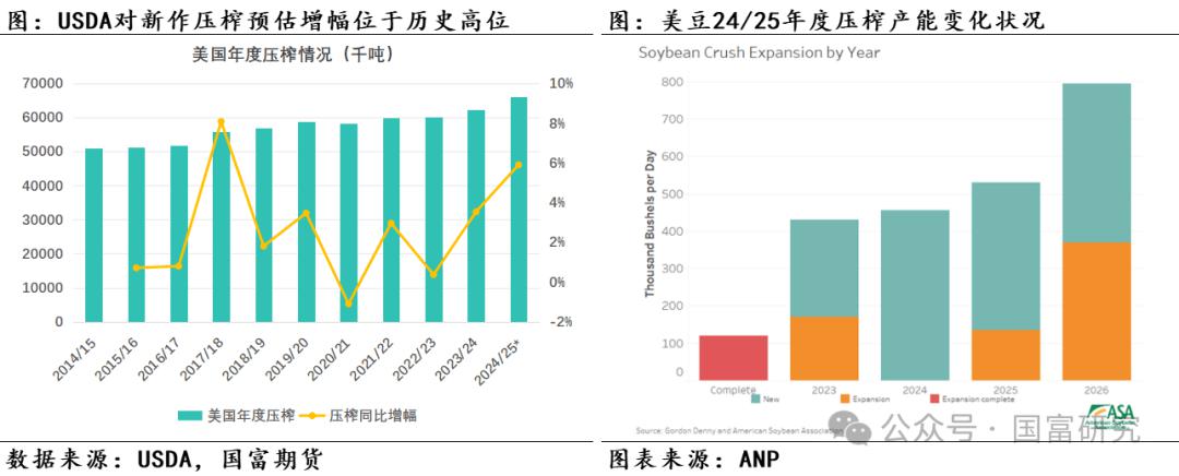 新作方面,USDA预计美豆新作压榨较23/24年度压榨增5.9%至24.25亿蒲,USDA对新作压榨预估的增幅位于近5年最高水平,对于新作压榨暂时维持USDA预估水平。
