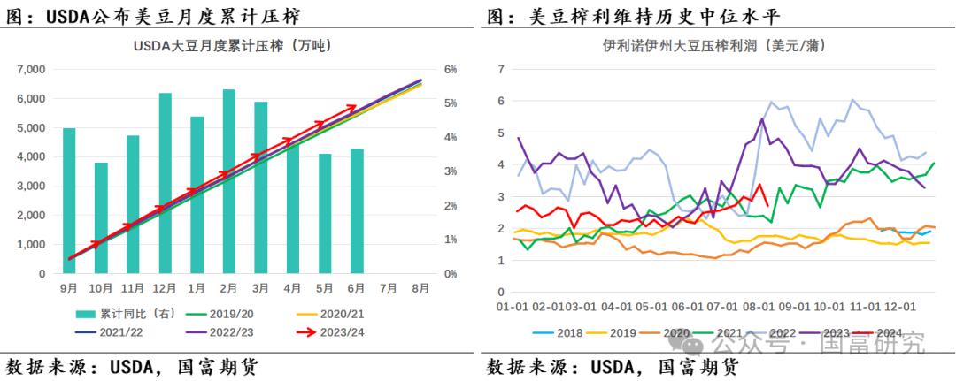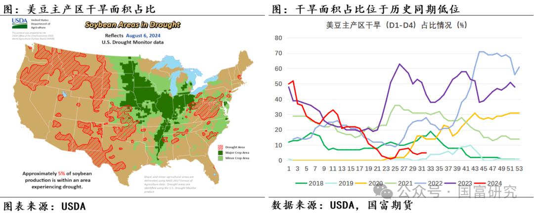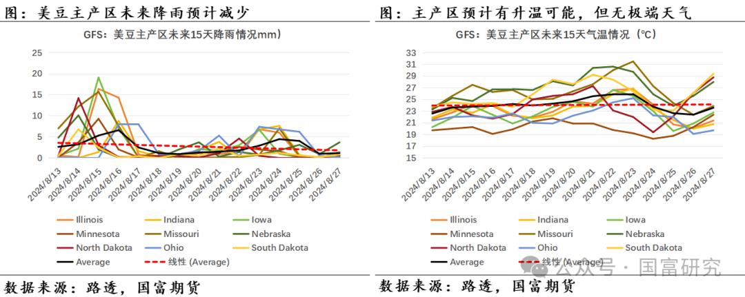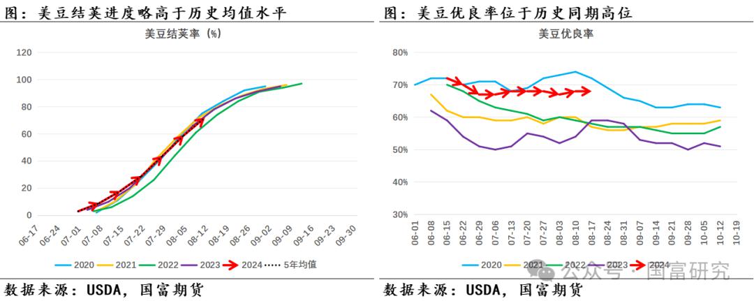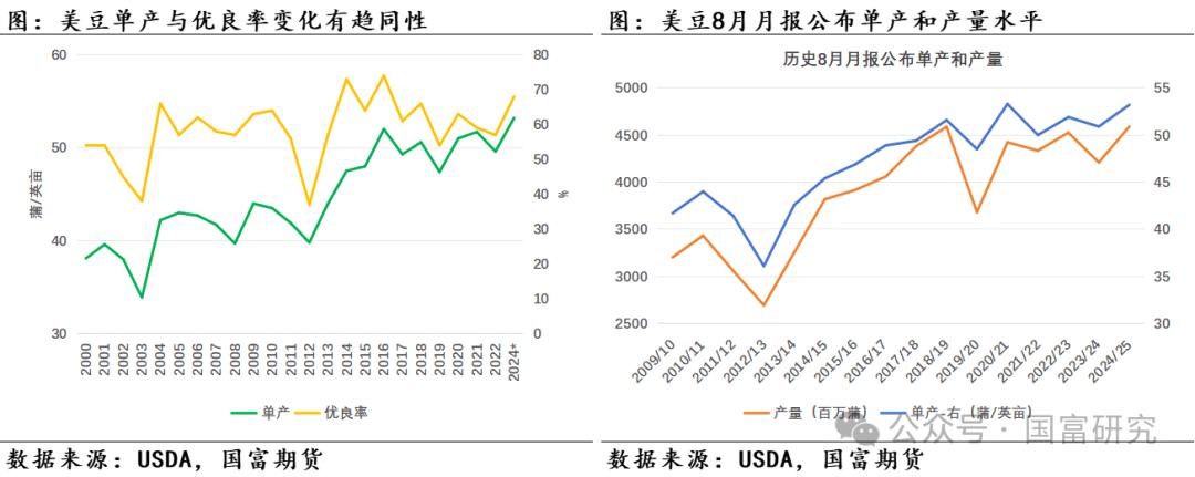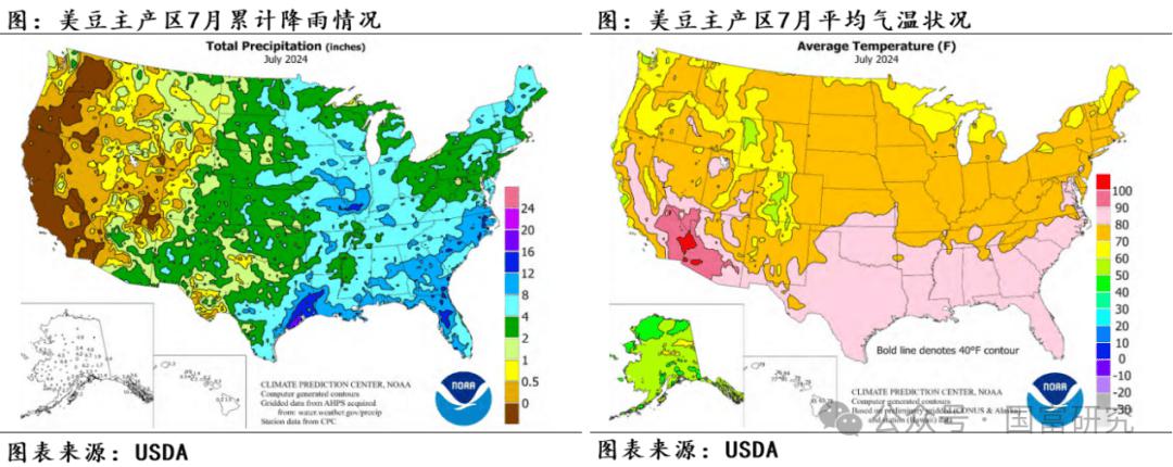 单产上看,7月良好天气状况支撑月报给出高单产预估,8月少雨天气导致单产或有下调风险,但不改美豆丰产格局。