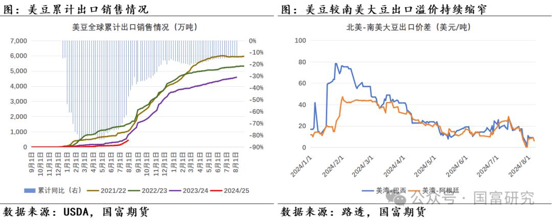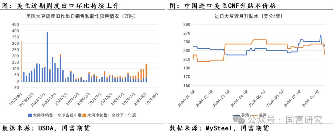 旧作方面,USDA 8月报告维持23/24年度美豆出口4626万吨的预估,同比降幅为14.66%。受美豆新作产量增长超市场预期影响,美农为新作腾出库存而积极出清旧作大豆导致销售意愿较强,近期美豆国内现货价格持续下跌。根据美豆出口最新数据显示,截止到8月8日,23/24年度美豆累计出口4618万吨,累计同比降幅为12.94%,低于USDA预估的累计同比降幅。美豆当前出口情况略好于USDA预估情况,短期在美农出清旧作需求、新作预期供应压力较大的影响下,美豆出口压力偏高将导致美豆升贴水持续下跌。23/24年度美豆累计出口距USDA月报预估目标仅剩余约8万吨缺口,叠加近期美豆升贴水相对于南美大豆具有一定价格优势,预计美豆旧作出口目标大概率实现。