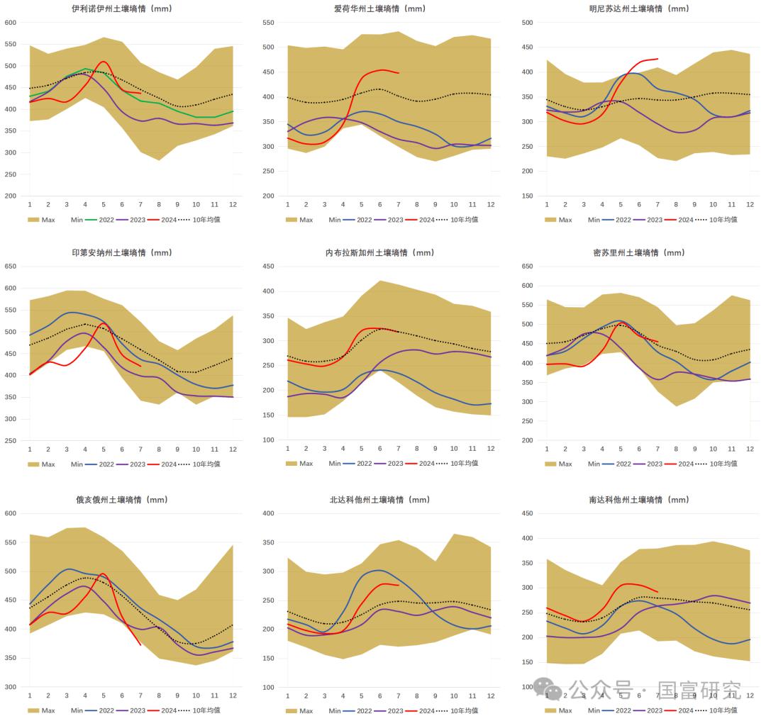 从8月天气状况来看,美豆主产区气温状况良好,降雨集中在东部和北部地区,中西部美豆主产区降雨有偏少可能。路透预估数据显示,未来14天(8.13-8.27)各主产区平均日度降雨大致在5mm以下水平,且从周度角度看有持续下滑的趋势。不过从主产区气温状况来看,主产区气最高气温大致在31摄氏度以下,平均气温大致在24℃上下,主产区气温呈现“高温不高”状况。综合看,降雨偏少对土壤墒情有不利影响,但气温缓解导致不利影响有限,而土壤墒情对美豆优良率有着明显的支撑作用,美豆单产预计可能有下调风险,但预计下调后的单产将维持在较高水平。结合目前各州的土壤墒情状况以及未来降雨变化,最终我们预计后续单产可能会下修至52.6蒲/英亩。