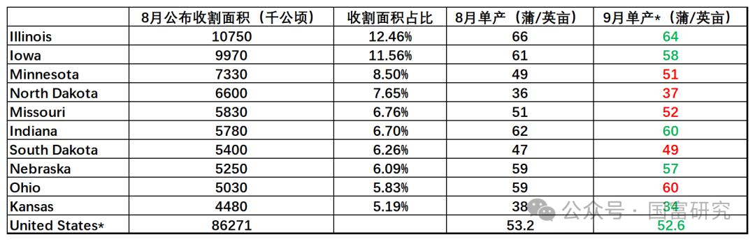 注:仅列举主要产区单产调整,计算52.6蒲/英亩实际考虑了所有州的单产变化。