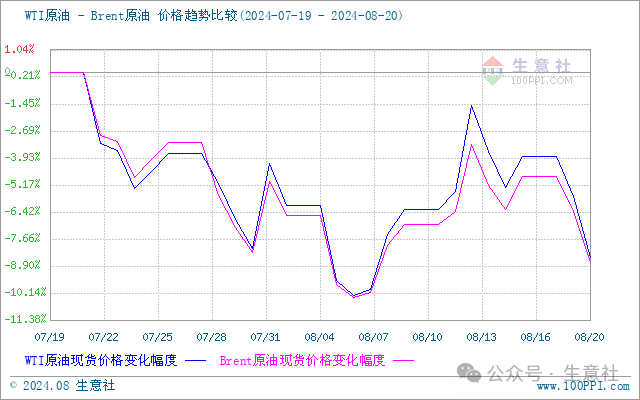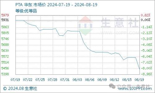 据生意社商品行情分析系统,近期国内PTA市场行情震荡偏弱调整,截止8月19日,华东地区PTA现货均价在5446元/吨,较12日价格下跌近3%。上周初主力供应商官宣PTA装置检修计划,叠加原油价格上涨提振PTA市场。但随着原油走跌以及需求端维持偏弱格局,PTA价格震荡下跌。